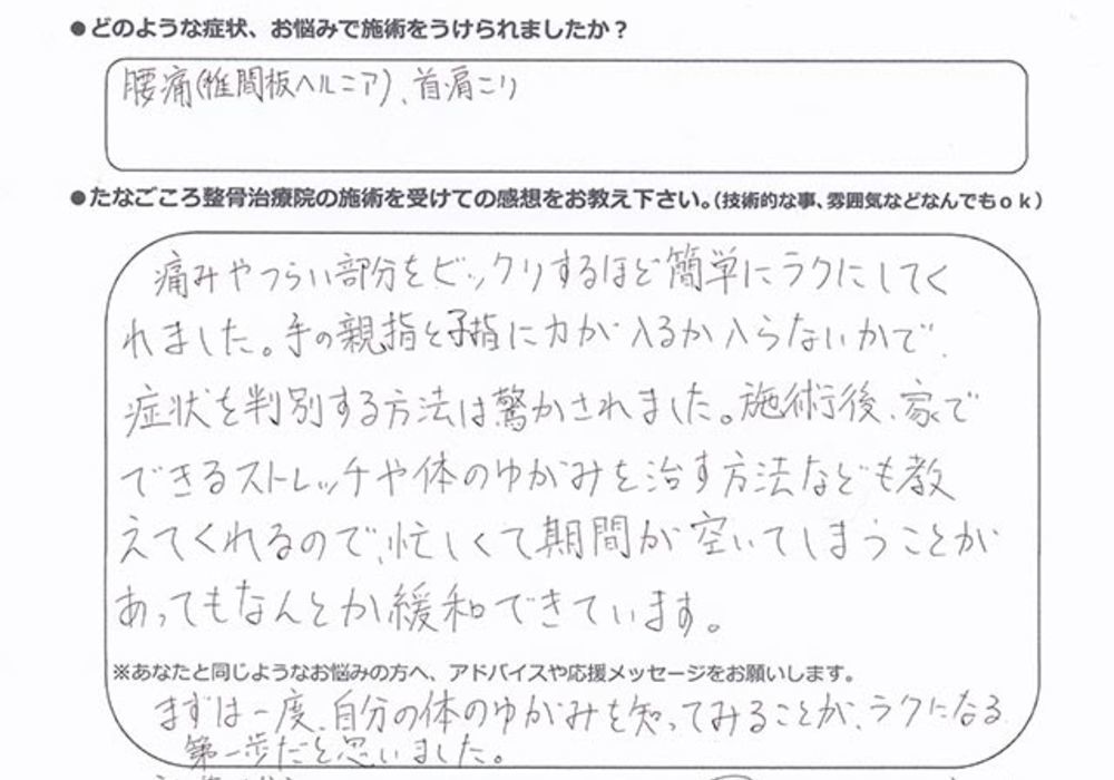 腰も施術を受けて楽になりました。
