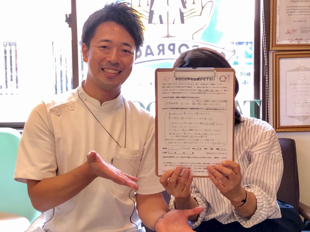 施術後、家でできるストレッチや体のゆがみを治す方法なども教えてくれるので、忙しくて期間が空いてしまうことがあってもなんとか緩和できています。Q3.あなたと同じようなお悩みの方へ、メッセージをお願いします。