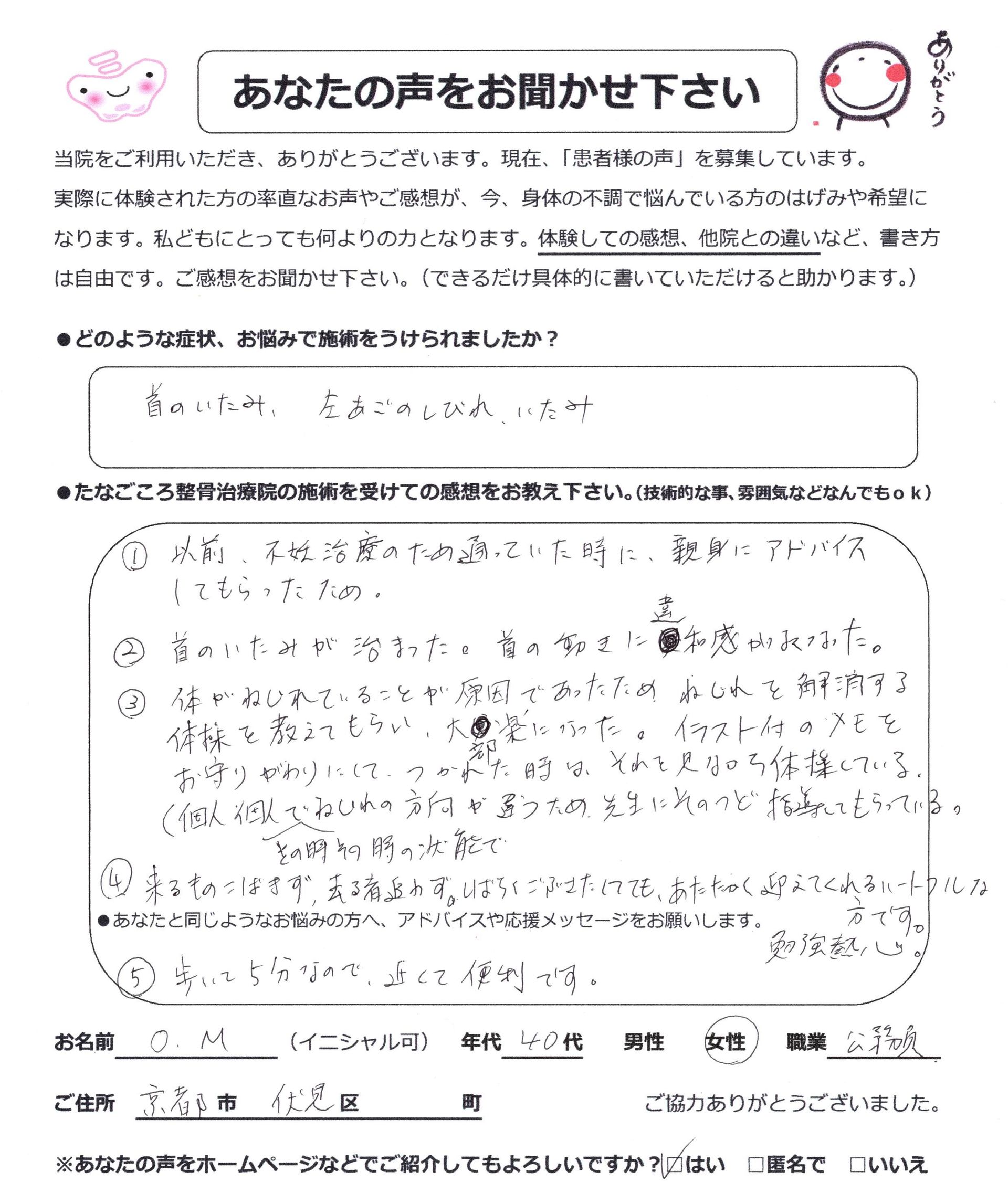 顎・首の痛みが治まった! O.Mさん(40代女性・公務員)