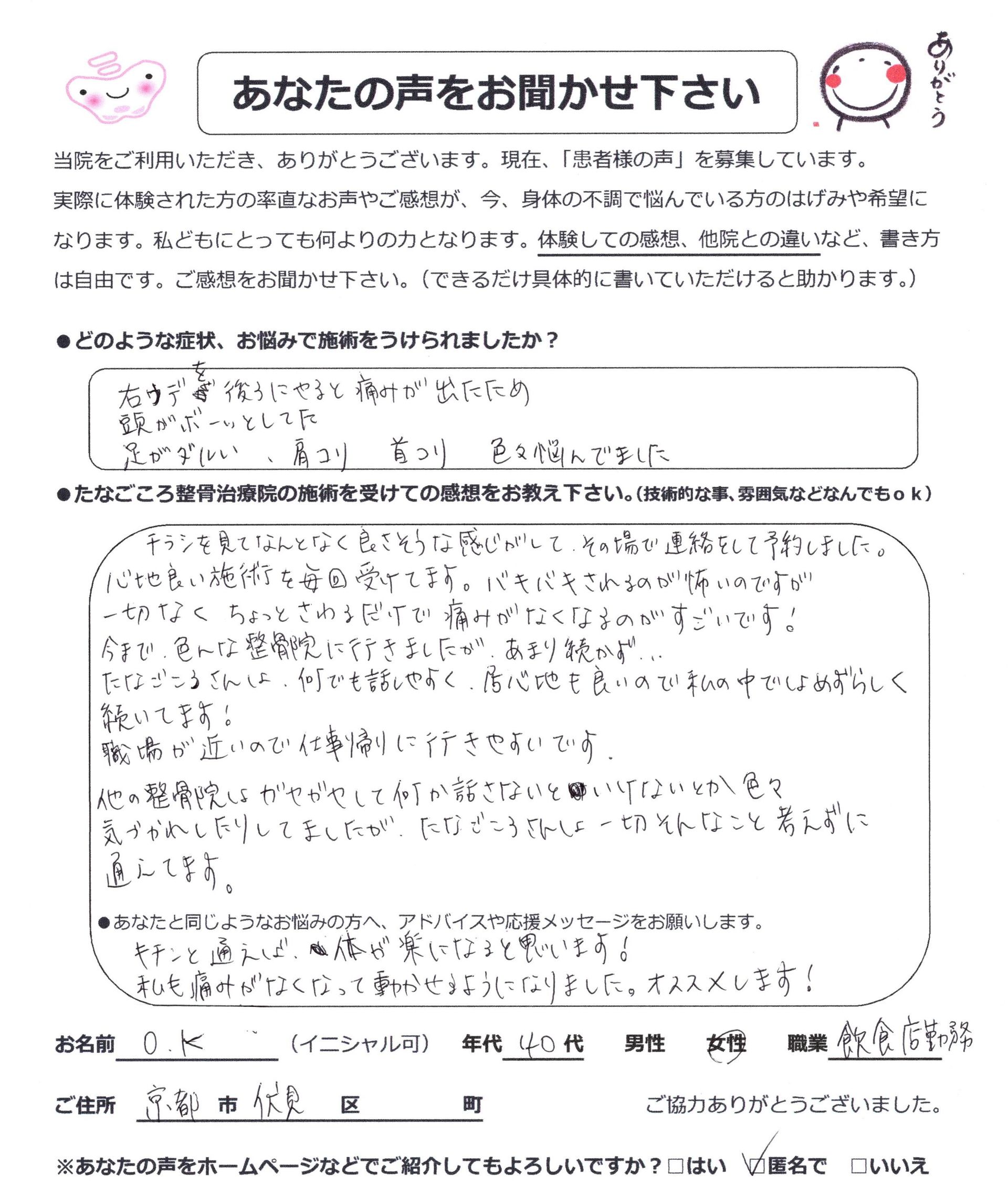痛みがなくなって動かせるようになった! O.Kさん(40代女性・飲食店勤務)